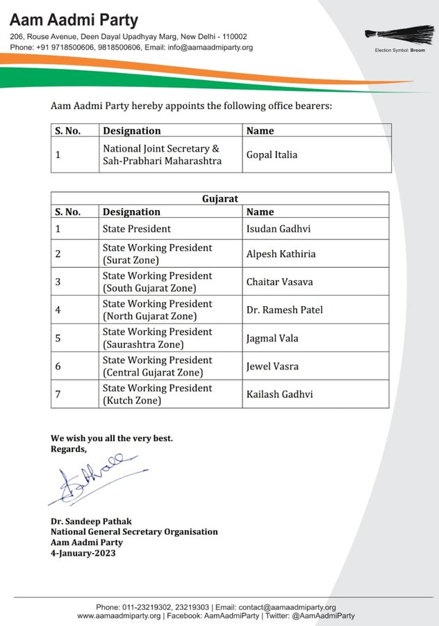 - ગોપાલ ઈટાલિયાને મહારાષ્ટ્રના સહ પ્રભારી બનાવ્યા તેમજ નેશનલ જોઈન્ટ સેક્રેટરી તરીકેની જવાબદારી આપવામાં આવી