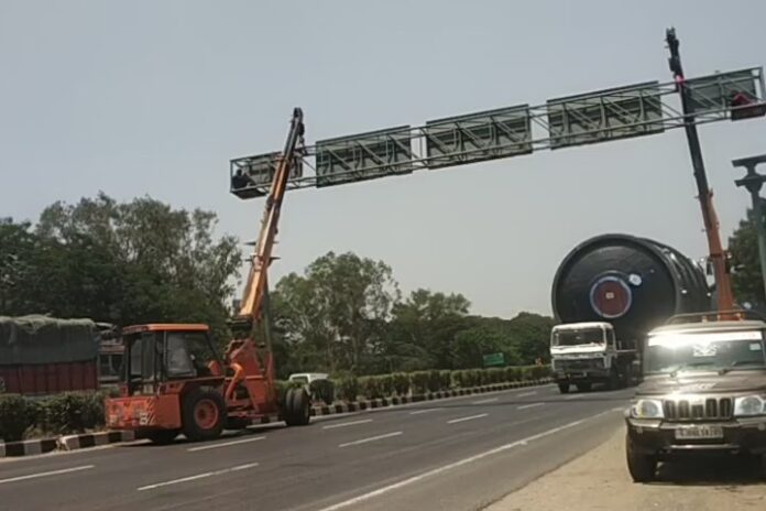 6 મહાકાય મશીનરી લદાયેલ ટ્રેલરને સુરત તરફ પસાર કરવા માટે બે ક્રેઇન બોલાવવાની ફરજ પડી હતી. બે ક્રેઇન આવ્યા બાદ 100 ફૂટની ઊંચાઈએ લગાવેલા સાઈન બોર્ડનું ઉપરનું એન્ગલ ખોલવામાં આવ્યું હતું. બે કામદારોએ એન્ગલ પર બેસી ક્રેઇનથી તેને ઊંચું કર્યા બાદ તોતિંગ મશીનરીના ટ્રેલરો એક બાદ એક આગળ પસાર થયા હતા.